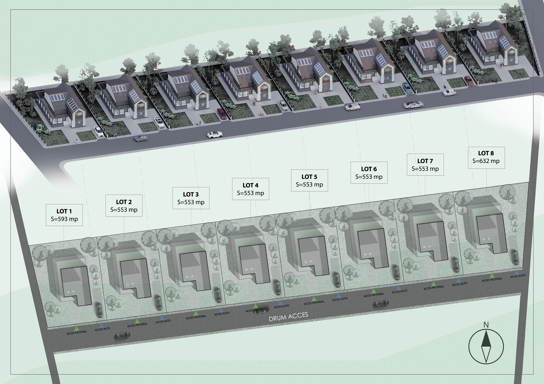 2 locuri de parcare pentru fiecare casă și locuri de parcare pentru vizitatori.
